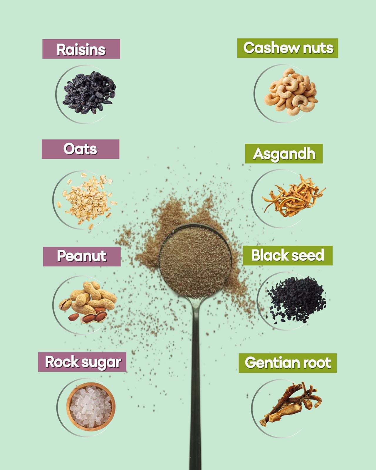 -Almond, Peanut, Wallnuts, Oats, Asgandh, Black seed, Gentian root, chamomile, Rock sugar, Cashew nuts, Raisins.